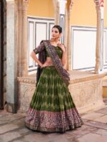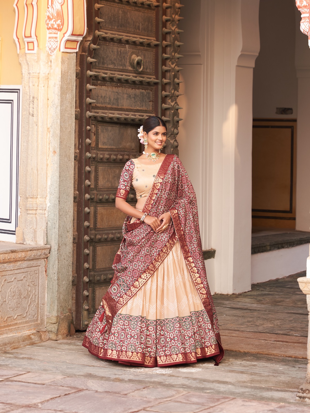 In the embrace of Tussar Silk, adorned with Ajarakh prints, the lehenga choli becomes not just a garment, but a reflection of tradition, grace, and beauty.