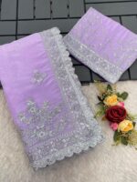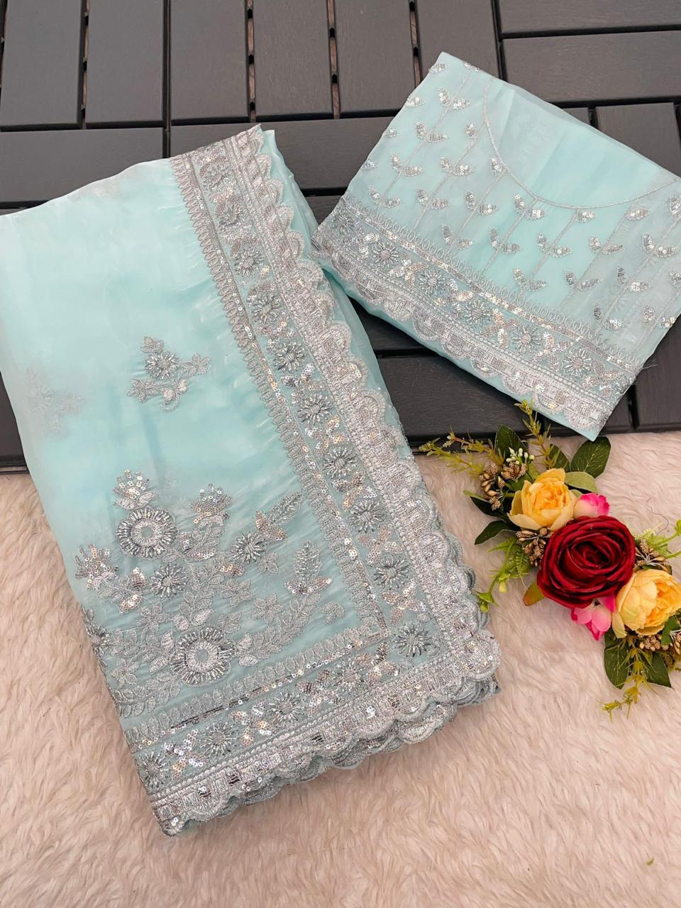 BEAUTIFUL MULTICOLOURED DIGITAL PRINT ON ORGANZA SAREE WITH HEAVY EMBROIDERY BORDER WITH SMALL BUTTI WORK. UNSTITCHED EMBROIDERY ORGANZA SILK BLOUSE