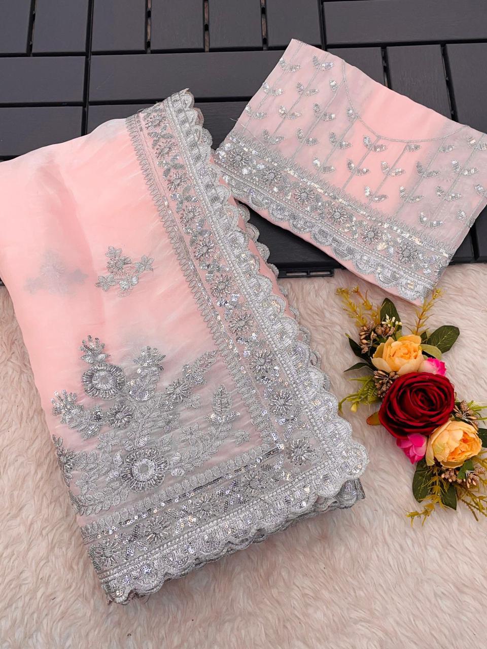 SAREE: PURE ORGANZA SAREE WITH MULTICOLOUR DIGITAL PRINT AND MULTICOLOURED THREAD EMBROIDERY WORK..!